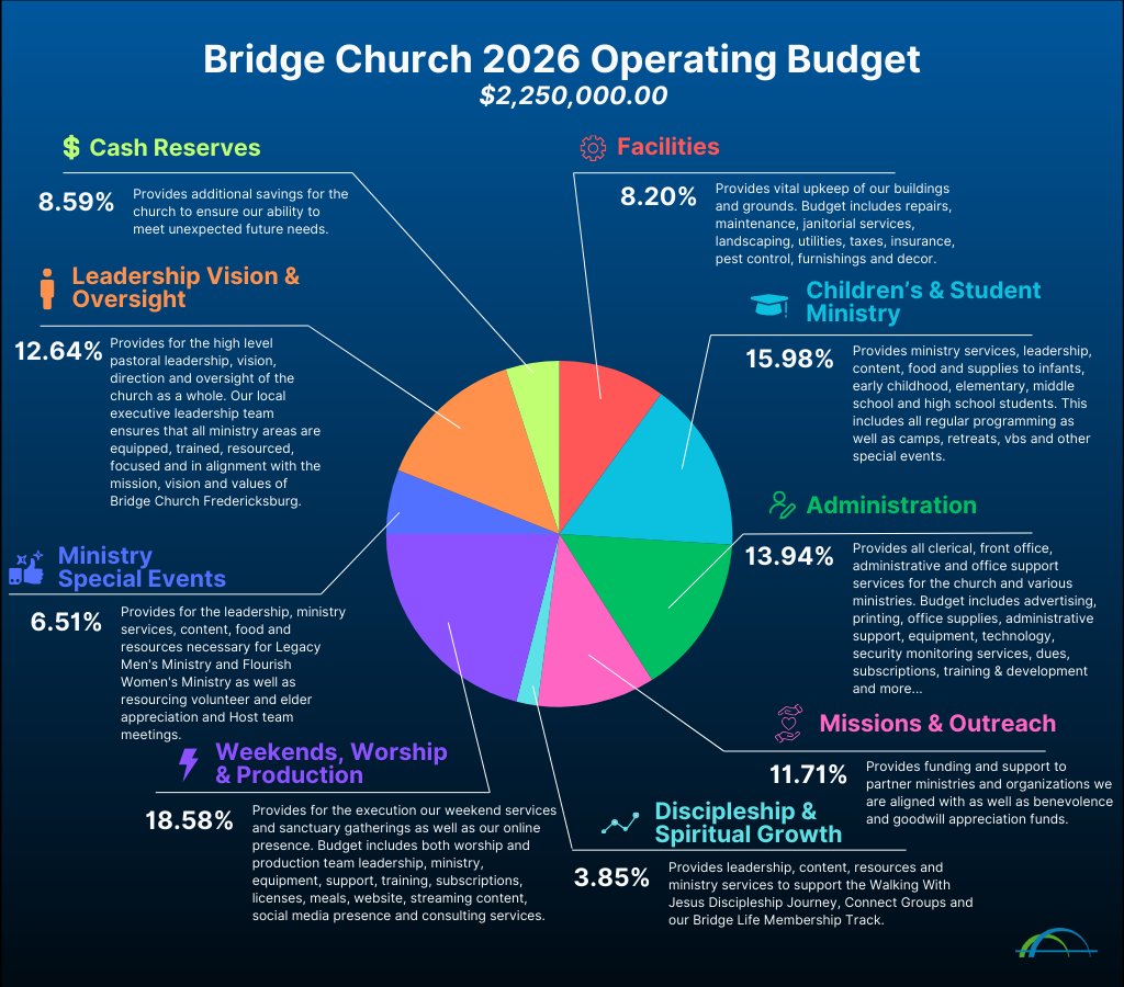 Our church creates an annual budget guided by the vision set by our Lead Pastor and Board of Directors. From there, our staff and ministry leaders collaborate to prepare detailed budgets for all areas of ministry and operations.